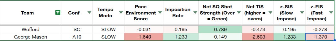 It’s axiomatic that a big underdog wants to “shrink the game” by limiting possessions, thereby eroding the overall edge for the fave. But what happens when the big fave is the one who wants to lower the possession count? Well, it can get dicey. Mason is a classic slow imposer, posting the 11th-least favorable “pace environment” nationally last year and is likely set to do so again this year despite a near-wholesale roster flip. Early steam towards on the Patriots, perhaps due to the uncertainty surrounding Wofford’ late-offseason coaching switcheroo (and concomitant questions about player buy-in after the accompanying tumult of Perry’s departure). Personally, I wouldn’t be running to lay 15+ with a snail like GMU, particularly against an opponent who also won’t be pushing pace.