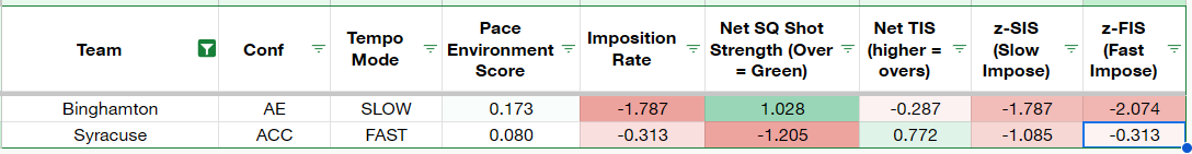 Similar to what I said about Air Force, Binghamton “wants” to play slow, finishing 333rd in 2024-25 in offensive APL at a crawling 19.3 seconds. The issue is that nobody really gives a shit what Binghamton wants. If this sounds familiar, well, it should, because Syracuse, like Binghamton, allowed opponents to score quickly at the other end (6th-fastest defensive APL). Syracuse will often self-destruct if forced to work in the half court, but with vastly superior athletes against this sieve-like defensive scheme, they can more or less do whatever they want and force Binghamton to speed things up.